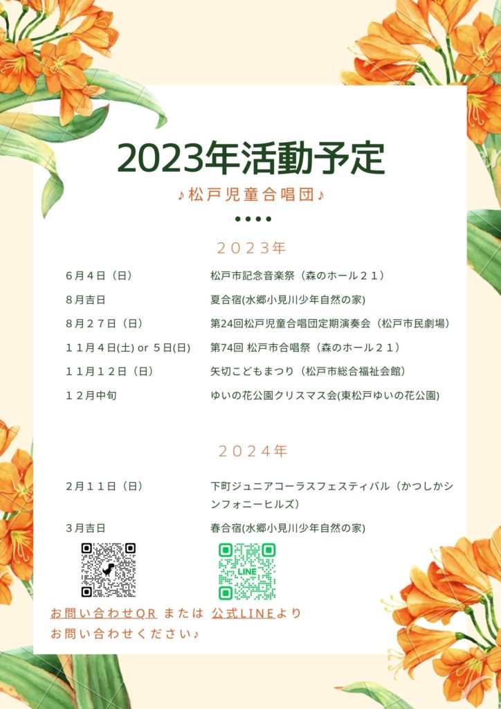 2023年4月2日 / 最終更新日時 : 2023年4月2日 matsudojc お知らせ ♪2023年度活動予定♪ 今年度の年間活動予定です♪ この他にも予定が追加されることがあります✨ 今年は夏に定演があります❣️ 予定をご覧いただき、不明な点がございましたらお気軽にお問い合わせください😊 BlueskyCopy